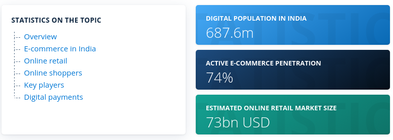 - With the exponential growth in internet and digital population of 687.6 Million in India and an active e-commerce penetration of 74%, it is estimated that online retail market size will be $73 Billion.
